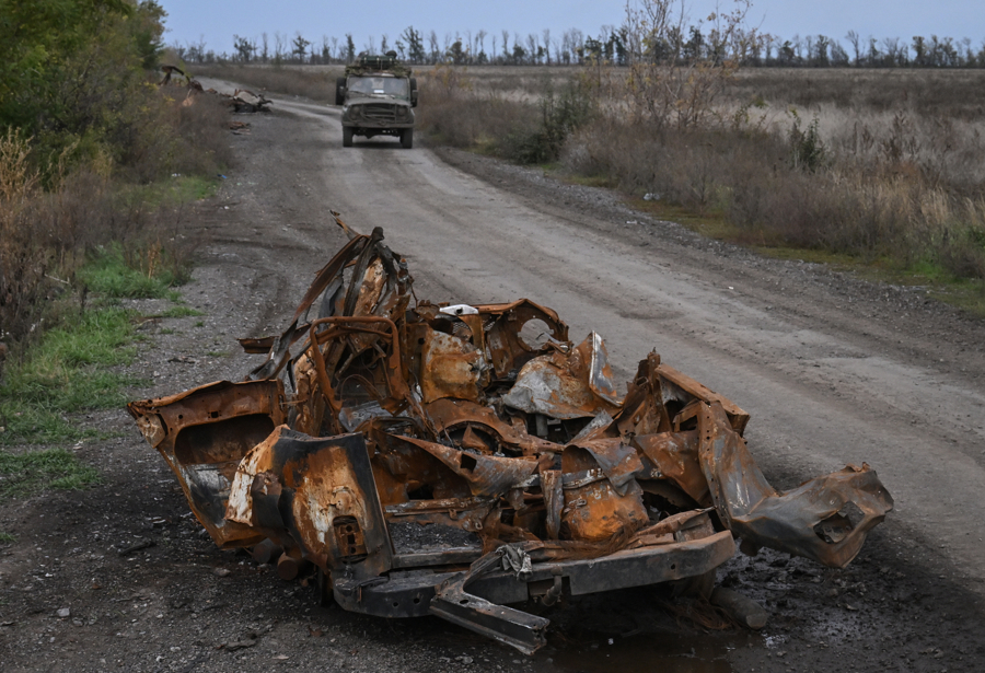 俄乌冲突前线克拉斯诺阿尔梅斯克(乌克兰称波克罗夫斯克)地区,路边一辆被毁车辆。